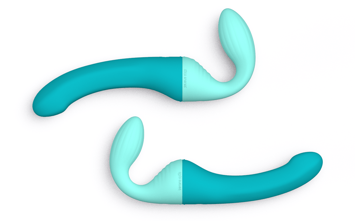Rendering of the Split blue and mint modular partner vibrator set composed of one Dollop vibrator and one Banana vibrator.