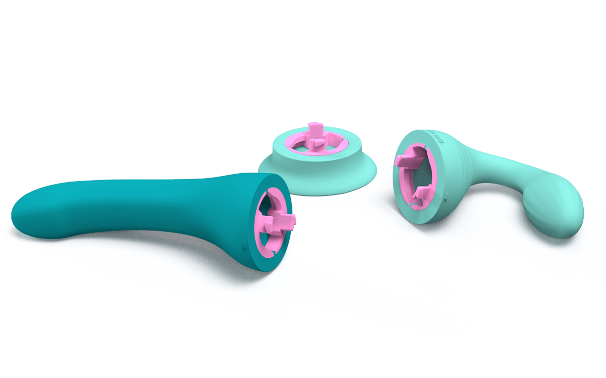 Rendering of the Dollop & Banana vibrators detached from their base, showing the pink connecting mechanism and suction base.